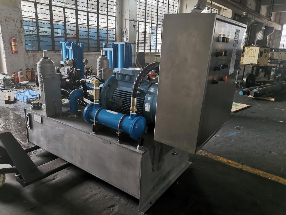 合作了12年的客户玖龙纸业,全球各地的分公司一直都有让我们供气缸、油缸及液压系统和泵等产品,主要生产及维修他们纸品机上用的。这次因急用,在国庆节前赶了一台防腐蚀性液压系统,这台液压系统主用于纸品挤渣机械。750L油箱采用304全不锈钢,电机采用的是ABB的,广东江门ABB公司我们也有供气动液压元件及治具等产品。电磁阀采用的是派克的。油温冷却、报警油温、油箱液位上/下限、报警装置、油液风冷等等配件,他们要求很是严格。不管再难,我们也可以搞定。就像去年年关做给格兰仕那两台大型制冷设备上用的液压系统一样一样的。